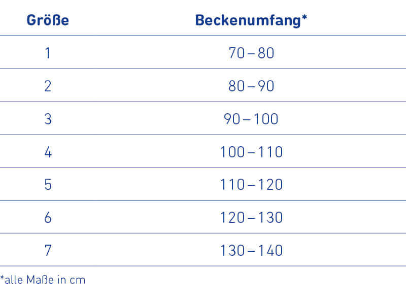 Die Becken-Orthese steht in sieben verschiedenen Größen zur Verfügung. Die richtige Größe richtet sich nach Ihrem Beckenumfang: