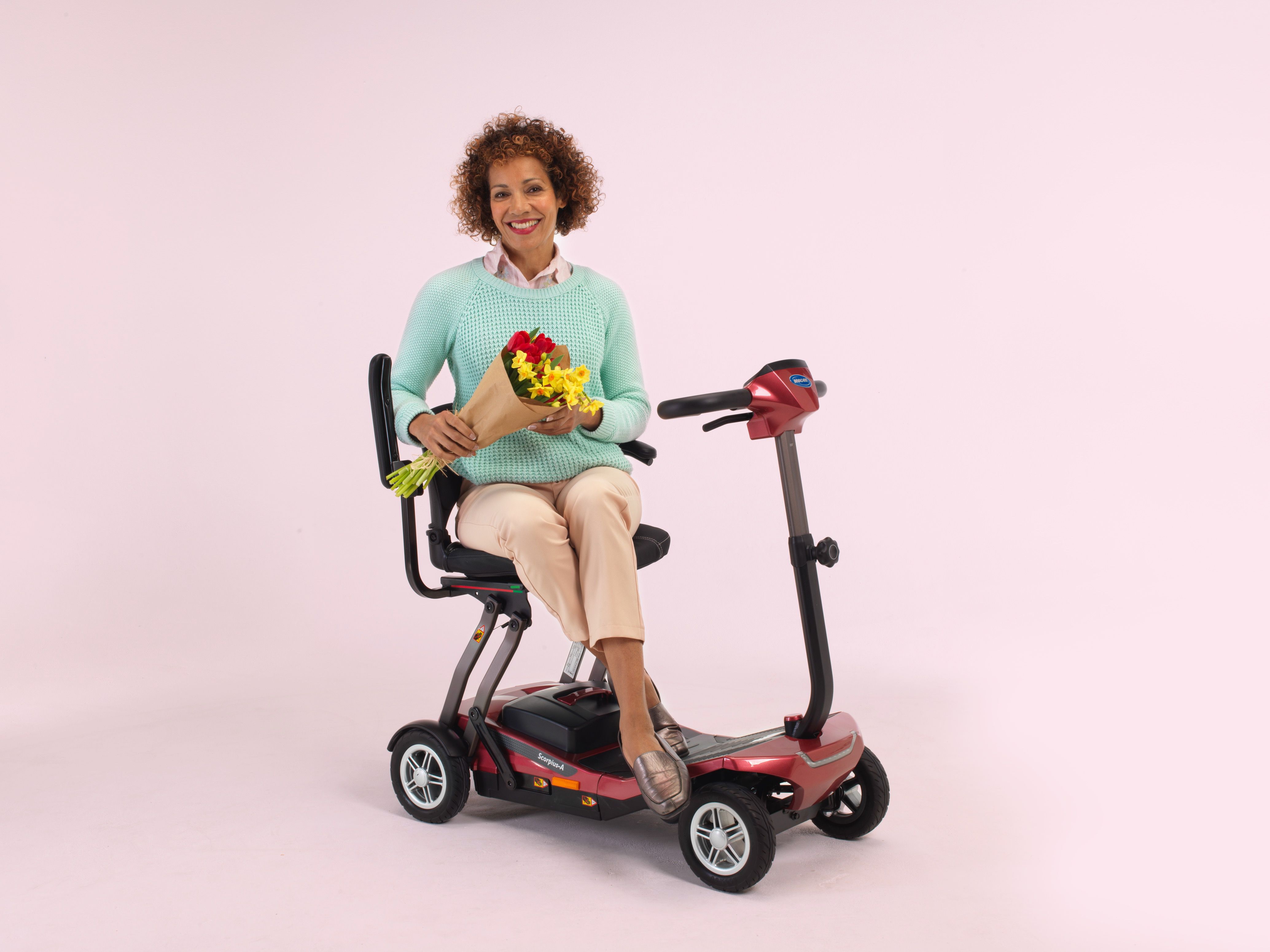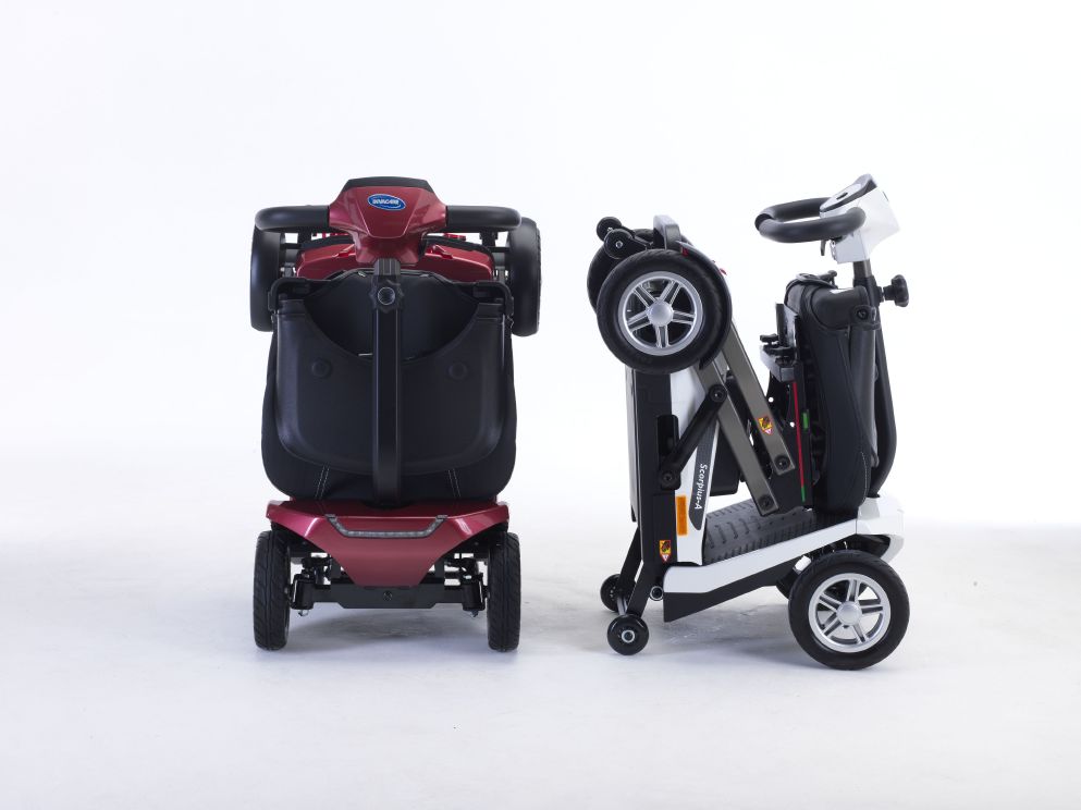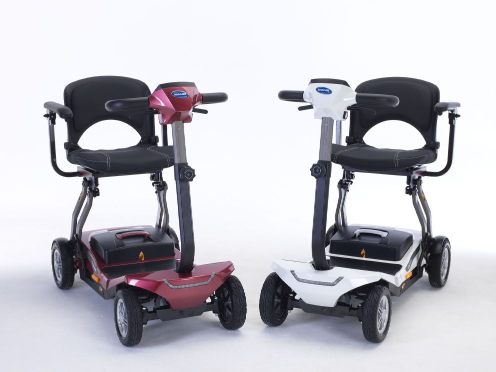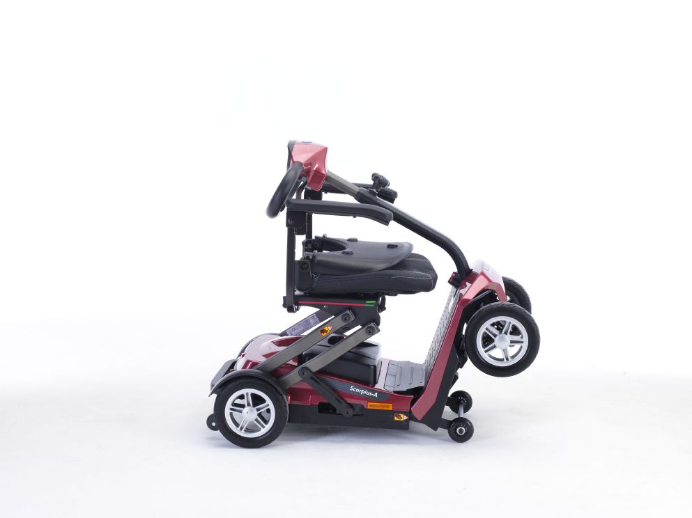 Mit dem neuen Elektromobil von Invacare haben Sie einen idealen Begleiter für Städtereisen oder auch für Flugreisen. Der Scorpius-A ist die Automatk-Version und verfügt über einen elektrischen Faltmechanismus. In 10 Sekunden ist der Scooter auf- oder abgebaut (siehe Produktvideo) und so kompakt wie ein Reisekoffer. Mit den praktischen Rollen lässt er sich ebenso ziehen wie ein Koffer.